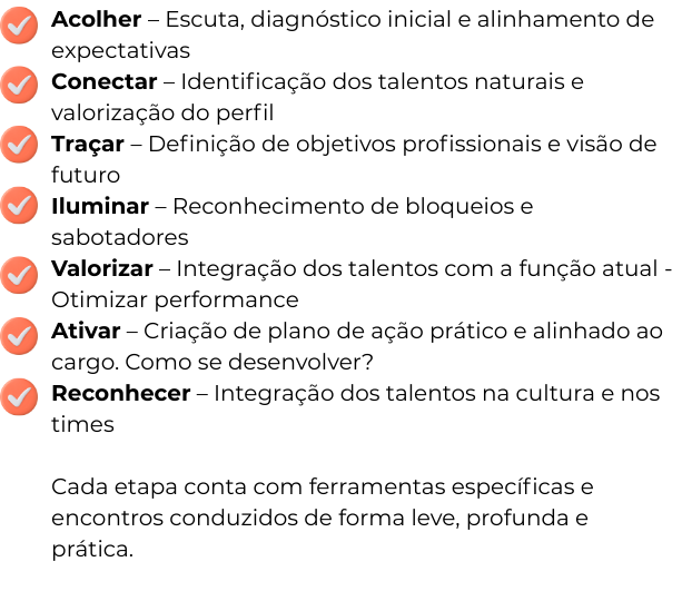Desenvolver talentos é mais do que treinar: é acolher, conectar, iluminar caminhos e ativar ações. O método ACTIVAR conduz esse processo de forma estruturada, profunda e humana — unindo ciência do comportamento, talentos naturais e inteligência emocional.