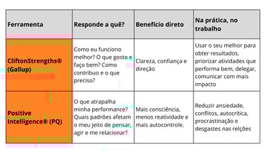 Talentos (CliftonStrengths®) + Sabotadores (PQ) + contexto real do seu trabalho/time.Tradução para o dia a dia